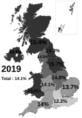 Smoking prevalence varies with geography. In self-reported Annual Population Survey data, the local authorities of Kingston upon Hull and Blackpool had consistently high smoking prevalence rates of 22.2% and 23.4% respectively in 2019, while Ribble Valley and Rushcliffe had rates of 5.1% and 5.9%.[22] It is estimated that in some of the most deprived communities in Scotland, smoking rates may be as high as 47%. An estimated 40% of adults smoke in the constituency of Glasgow East, one of the most deprived seats in the entire United Kingdom.