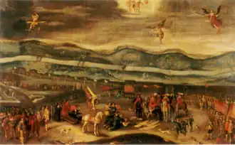 Shein began surrender negotiations in January 1634, and by February they were in full swing.[28] The Russians finally signed a surrender treaty on 25 February 1634,[6][13][28] and on 1 March they vacated their camp.[28] (Some scholars, such as Rickard and Black, give the date of 1 March for Shein's capitulation.)[9][14] Under the surrender terms, the Russians had to leave behind most of their artillery but were allowed to retain their banners after a ceremony in which they were laid before King Władysław. They also had to promise not to engage Commonwealth forces for the next three months.[28] Shein's forces numbered around 12,000 at the time of their capitulation, but over 4,000, including most of the foreign contingent, immediately decided to defect to the Commonwealth.[29]