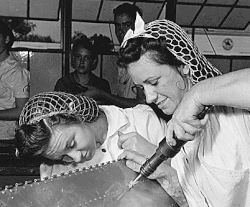 Decorative hairnets, popular among women in the Victorian era, were referred to as snoods. This term was then applied to any netlike hat, and, in the 1930s, to a net bag headgear. This latter meaning became popular during the Second World War when women joined the workforce en masse and were required to wear the headgear to avoid their hair getting caught by the moving parts of the factory machinery.[3]