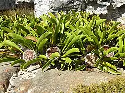 The shrub is dense, wooded and grows 3 m (9.8 ft) in diameter and blooms from January to April.[3][4] Fire destroys the plant but the seeds survive. The seed is stored in a cap, released after a long period and spread through the wind. The plant is unisexual. Pollination occurs through the action of rodents. The plant grows on sandstone soil on rock moldings at heights of 1,750–1,900 m (5,740–6,230 ft)[5]
