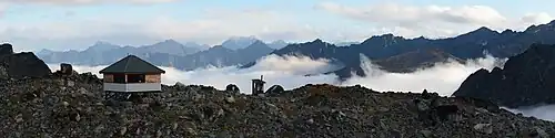 The new hut was designed for free by RIM Architects of Anchorage, Alaska, and completed in 2010 largely through extensive volunteer efforts.[2] The hut is open to the public and free to use year-round.[3] According to the American Alpine Club, "Guests should expect to share the hut with respect and consideration for others. In addition, this hut encourages understanding and cooperation among multiple parties that wish to use it. If additional parties arrive during your stay, please make an effort to accommodate them."[1] The GPS coordinates of the hut are 61 degrees 51.506 North by 149 degrees 12.113 West.[4] Hikers are cautioned not to rely on the hut as their sole source of safety or shelter, because it can be difficult to locate or already full.[2][1]