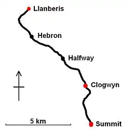| Halfway | 53°05′44″N 4°05′46″W / 53.0956°N 4.0960°W | 1,641 ft (500 m) | As the name suggests, halfway along the line and close to the 'Halfway House' on the nearby footpath. A short distance above the station is a path that leads down to the Halfway House cafe. |