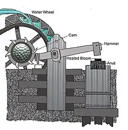 The mountains surrounding Snowville were, and in many places still are, rich with iron ore. One of the first factories established in Snowville was a trip-hammer forge. It was located at the confluence of Little Laurel and Big Laurel creeks (near present-day Blue Ridge Mountains Council property) and was operated by Asiel Snow and his son-in-law, David B. Bill. Cast and wrought iron products were transported to Snowville by wagons and oxen carts. The cast iron was collected as scrap and later made into stoves, kettles, corn shellers, cane mills, and many more other cast-iron products. The wrought iron on the other hand was quickly produced into horseshoes and horseshoe nails, buckboards and buggies, and hearses; it was also used in forgings for sawmills, gristmills, and cane mills.