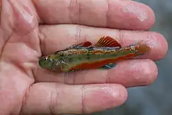 The snubnose darter has two recognized subspecies, including the Cumberland snubnose darter. E. s. atripinne, and the Tennessee snubnose darter, E. s. simoterum.[3] Intergradation between the two subspecies occurs in the lower Tennessee River unit.[3] The mean length of snubnose darters is 45 millimetres (1.8 in), the reported average clutch size is 152, and the maximum age is less than two years.[4] The snubnose darter inhabits riffles and rock-bottomed pools in streams with low turbidity.[3] As of 2000, the snubnose darter was listed as currently stable, meaning it is widespread and not in need of any immediate conservation action.[5]