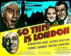 So This Is London is a 1939 British comedy film directed by Thornton Freeland and starring Robertson Hare, Alfred Drayton and George Sanders.[1] It is adapted from the 1922 play So This Is London by Arthur Goodrich which had previously been adapted into a 1930 film.[2] An American clashes with an Englishman over the merits of their respective countries, only to find that their children have fallen in love. It was made at Pinewood Studios by 20th Century Fox's British subsidiary.[3]