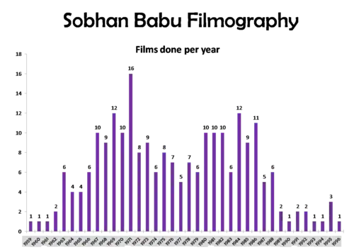 Sobhan Babu appeared in 230 movies between 1959 and 1996. In almost 200 of those, he acted in a leading role. The following is a list of the films in which he appeared.