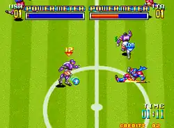 Soccer Brawl is a futuristic soccer game that uses either bionic people or cyborgs for the players. It is a two-player game where you pick a home land from one of eight countries. After selecting one of two stadiums, SNK Stadium in Osaka or Super Dome in San Francisco, the 5-on-5 soccer match begins with a goalie for each team. You can hold either A for a power shot while on offense, or A for a super shot to disable opponents while on defense. You can perform tackle and slide. Captain wears a kerchief, can't shoot and can make super shot. Power shots rebound from walls except walls behind the goalie.