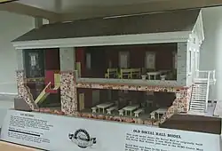 Ground was broken for the replica's construction at the park in September 1979.[72] Park officials had planned to replica the building using adobe brick like the original, but difficulties in producing the pioneer-building material surfaced and concrete slump blocks were used instead.[73] On July 24, 1980, the completed building was dedicated by church president Spencer W. Kimball, with Utah Governor Scott M. Matheson cutting the ribbon.[74][75] When larger-scale excavations of the Social Hall site occurred during construction of a tunnel in 1991, it was discovered that the hall was a different size than previously understood, and the park's replica had been built with different dimensions than the original.[2]