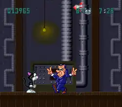 The game begins with Socks observing foreign spies stealing a nuclear missile launch unit in the basement of a foreign embassy.[1] He embarks on a journey through eleven stages through landmarks in the Washington D.C. area like The Pentagon to return to the Oval Office in the White House and alert the Clinton family.[2][3] Throughout the game, Socks must overcome the likes of foreign spies, politicians, the United States Secret Service, and the news media.[3] The bosses are caricatures of political figures, such as Gerald Ford, Jimmy Carter, and Ross Perot.[2][4] In one situation, Socks must push Millie the dog, pet of former president George H. W. Bush, out the front door to avoid Arab terrorist felines.[5] Also, Richard Nixon calls in bomb raids and Ted Kennedy is seen driving a car on a bridge.[6]
