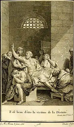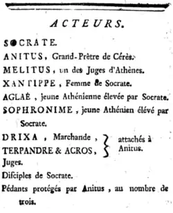 Socrates (French: Socrate) is a 1759 French play in three acts written by Voltaire. It is set in Ancient Greece during the events just before the trial and death of Greek philosopher Socrates. It is heavy with satire specifically at government authority and organized religion. The main characters besides the title role is that of the priest Anitus, his entourage, Socrates' wife Xantippe, several judges, and some children Socrates has adopted as his own.