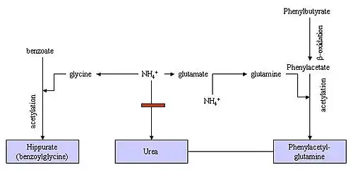 - ^ Brusilow S, Tinker J, Batshaw ML (February 1980). "Amino acid acylation: a mechanism of nitrogen excretion in inborn errors of urea synthesis". Science. 207 (4431): 659–661. Bibcode:1980Sci...207..659B. doi:10.1126/science.6243418. PMID 6243418.