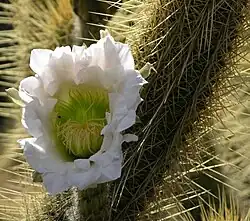 The funnel-shaped, white flowers open at night, and can grow 18 to 20 cm (7.1 to 7.9 in) long. The spherical to ovoid fruits have a diameter of up to 2 cm (0.79 in).[3]