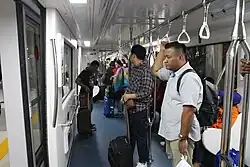 The system uses Airport Automated People Mover System rubber-tyred metro manufactured by state-owned enterprise PT LEN Industri in cooperation with South Korean Woojin Industries.[4] Three train units operate with each train unit consisting of two cars. They are capable to transport 176 passengers in one trip. The train travels at a speed of 60 kilometers per hour. Each trainset is equipped with automated guide-way transit (AGT) technology. The system is capable for automated operations, but its implementation have been delayed pending trials conducted by LEN Industri.