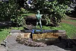 In 1999, the Sofus Madsen Museum opened in the house.[7] It contains up to 180 sculptures, medals, drawings, and tapestries, some of which were made by his wife, Grethe Corneliussen Madsen.[7] Madsen mostly created human figures in a classicist style with poses and expressions reflecting the attitudes and emotions in the themes he addressed. His most prominent work is Merkur (Mercury), which is located on the tower of the Sundt department store on the main square in Bergen, Torgallmenningen. The tower and statue rise 35 meters (115 ft) above the six-story building itself. Altogether there are 28 sculptures and reliefs by Sofus Madsen in Bergen.