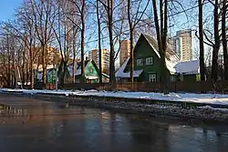 Sokol (Russian: Сокол) also known as "artists' settlement" (Russian: посёлок художников)) is the first cooperative residential settlement in Moscow,[1] founded in 1923. It is located in the Northern Administrative Okrug, not far from the later built Sokol metro station. The settlement "Sokol" became one of the embodiments of the garden city concept. Since 1979, the settlement has been under state protection as a monument to urban development of the first years of Soviet power. Since 1989, the settlement "Sokol" has been self-governing. The architects of the settlement "Sokol" implemented the concept of the "garden city",[1] which was popular in the early 20th century. The idea of a settlement that would combine the best features of the city and the village was put forward by the British Ebenezer Howard in 1898. As early as 1903, a project appeared to build a similar garden city on Khodynka Field in Moscow. This project was being developed for some time, but the events of 1914-1917 prevented its implementation.[2] The urban development plans of the 1920s - "New Moscow" by Alexey Shchusev and "Greater Moscow" by Sergei Shestako - also widely used the idea of a "garden city". The outskirts and suburbs of Moscow were supposed to be built up with settlements consisting of low-rise buildings, which were to have their own libraries, clubs, sports and children's playgrounds and kindergartens.[3]
