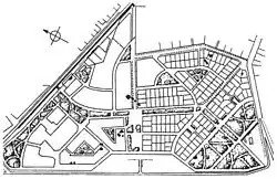 The original plan for the Sokol settlement was developed by N. V. Markovnikov using the Hippodamian system: the streets intersected at right angles and divided the settlement into several identical blocks. But later V. A. Vesnin joined the work on the plan, and together they decided to give preference to a free layout.[37]