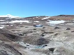 Sol de Mañana lies in the San Pablo de Lipez municipality (Sud Lipez Province),[2] in a remote and uninhabited region of Bolivia.[3] In an area of 10 square kilometres (3.9 sq mi)[4] there are steam vents, mud pools, hot springs, geysers and fumaroles.[5][4] Apart from Sol de Mañana proper there are additional geothermal manifestations dispersed a few kilometres south-southwest[6] at Apacheta[7] and 12 kilometres (7.5 mi) from Sol de Mañana;[4] north-northwest at Huayllajara;[7] The first two feature hydrothermally altered rocks[6] and sometimes they are considered to be separate geothermal fields.[8]