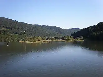 Lake Międzybrodzkie on the Soła river at the foot of Międzybrodzie Bialskie village, located 30 kilometres (19 mi) south of Auschwitz; about half-an-hour drive along Road DW 948 |