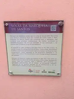 2. ^ a b c d e f g h i j k l m n o p q r "Solar da Marquesa de Santos". Museu da Cidade. Archived from the original on 20 November 2011. Retrieved 12 November 2016.