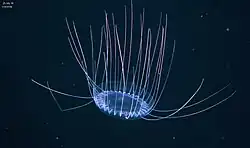 Solmissus, or dinner plate jellyfish, is a genus of hydrozoans. Its species are unique among cnidarians in that they actively hunt for prey as opposed to passively waiting for plankton to pass by. They are found in the deep waters of Monterey Bay, California. They are most likely to be found in the deep sea, mid water (700–1,000 m (2,300–3,300 ft)). They grow to be 20 cm (7.9 in) in diameter. These hydrozoans feed on gelatinous zooplankton, including salps and doliolids, ctenophores, jellyfish, and copepods. However, Solmissus may be limited to feeding on soft-bodied prey by the type of nematocysts on their tentacles (Mills).
