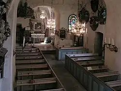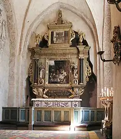 The choir is dominated by the altarpiece, sculpted in wood in 1666 by Hans Jerling.[1] The altarpiece frames two oil paintings with biblical motifs, and is crowned by a wood-sculptured Madonna from the late 16th century, while the altar is made of brick and covered by a limestone plate.[1]