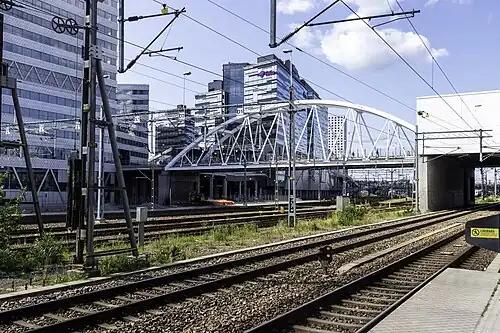 Solna is a station in Solna Municipality in Stockholm for commuter trains and the Tvärbanan light rail. The lines J40 (Uppsala C-Södertälje C), J41 (Märsta-Södertälje C), J42 (Märsta-Nynäshamn) and L30 (Sickla-Solna station) stop here, as well as ten bus lines. The commuter train station opened in 1895, but was moved a 100 meters in 1903 and moved again in 1911, when the tunnel through the hill Hagalundsberget to the south was completed. In 1955 the name of the station was changed from "Hagalund" to "Solna".[2] The northern entrance is located at a bridge connecting the Arenastaden and Frösunda areas of the Järva district. Arenastaden is home to the Strawberry Arena and the Westfield Mall of Scandinavia. The southern entrance is located between the districts Hagalund and Råsunda.[3] In 2014 the Tvärbanan line was extended to the south entrance, with a stop called Solna station.[4] A metro station, named "Arenastaden", on a new extension from Odenplan, is planned to have its southern entrance next to the Tvärbanan station, on the other side from the railway station entrance, while the northern exit will be just south of the Arenastaden area.[5] On an average day, 20 900 journeys are done by commuter train from Solna station, 5 200 by Tvärbanan and 4 600 by bus.[1]