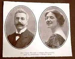 Before her marriage Krushelnytska had been proposed by at least three men: theological seminary graduate Zenon Hutkovskyi, lawyer Teofil Okunevskyi and pharmacist Yosyp Bilynskyi. During a court process related to the cancellation of one of her planned concerts in Naples in 1906, which was caused by the eruption of Mount Vesuvius, Solomiya met Cesare Riccioni, an Italian lawyer, and they soon became a couple. Krushelnytska and Riccioni married on 19 July 1910 in Buenos Aires during the singer's tour around South America. They settled in Viareggio, where Riccioni was several times elected as mayor. The family's villa became a point of attraction for numerous artistic figures, including Giacomo Puccini, Titta Ruffo, Giuseppe De Luca, Giuseppe Anselmi and Alfredo Casella. After Riccioni's death in 1936 Krushelnytska remained a widow.[3]