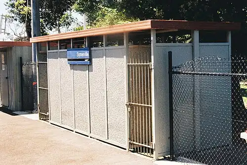The station building on the platform at Somerville was portable, meaning that it was delivered in sections and bolted together. It contained an office and a safeworking area, from which the staff and ticket system was operated. There was a van shed for small goods and parcels, two waiting rooms, one exclusively for the ladies and a general waiting room, and toilets. The building existed until February 1986, when it was replaced with an aluminium building.[6][7] In the station yard, there was a general goods shed, a loading ramp, a crane, and a livestock loading facility. Later, two sidings were built for the Somerville Co-operative Cool Stores. By 2008, the up end connection to the yard was removed.[3]