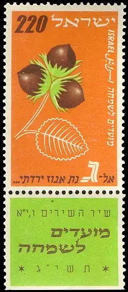 ![]() Inscription "I went down into the garden of nuts" and on tab: "Song of Solomon 6:11", "Joyous Festivals 5713" stamp - 220 mil. | |