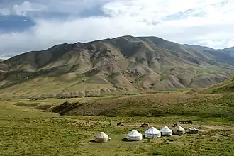 Songköl Too (Kyrgyz: Соңкөл тоосу) is a range in the Internal Tien-Shan that arcuately frames Songköl Valley from the north and separates Songköl Valley with Song Kol Lake from Jumgal Valley, and Telek Valley. It is located in Jumgal and Kochkor districts of Naryn Region. The length of the range is 92 kilometres (57 mi), and width up to 9 kilometres (5.6 mi). Average altitudes are 3,560 metres (11,680 ft) and the maximum altitude - 3,856 metres (12,651 ft). Difference in elevation between Songköl Too and Songköl Valley - 500–600 metres (1,600–2,000 ft), and between Songköl Too and Jumgal Valley - 1,400–1,600 metres (4,600–5,200 ft). Picks are gentle in the western part of the range and rocky - in the eastern. The northern slopes are steep and sharply rugged, and southern ones are gentle. The range is composed by majorly limestone.[1][2]