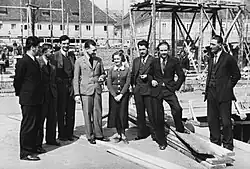 ![]() Sonja Lapajne (centre) at the NUK construction site in Ljubljana, circa 1926 | |