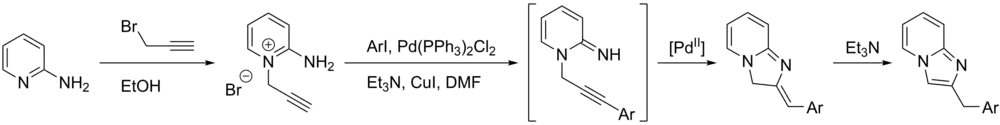 {{cite journal}}:|first1=has generic name (help) - ^ a b Bakherad, M.; Nasr-Isfahani, H.; Keivanloo, A.; Doostmohammadi, N. (2008), "Pd–Cu catalyzed heterocyclization during Sonogashira coupling: synthesis of 2-benzylimidazo[1,2-a]pyridine", J. Organomet. Chem., 49 (23): 3819–3822, doi:10.1016/j.tetlet.2008.03.141
