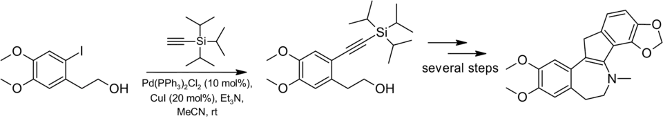 An example of the coupling of an aryl iodide to an aryl acetylene can be seen in the reaction of an iodinated alcohol and tris(isopropyl)silylacetylene, which gave an alkyne, an intermediate in the total synthesis of the benzindenoazepine alkaloid bulgaramine.[49]