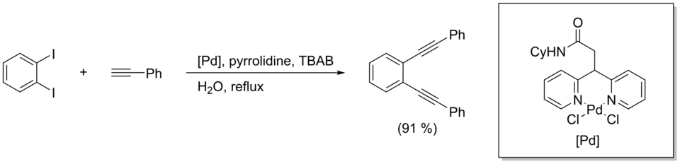 More recently, the dipyridylpalladium complex has been obtained and has been used in the copper-free Sonogashira coupling reaction of aryl iodides and bromides in N-methylpyrrolidinone (NMP) using tetra-n-butylammonium acetate (TBAA) as base at room temperature. This complex has also been used for the coupling of aryl iodides and bromides in refluxing water as solvent and in the presence of air, using pyrrolidine as base and TBAB as additive,[40] although its efficiency was higher in N-methylpyrrolidinone (NMP) as solvent.