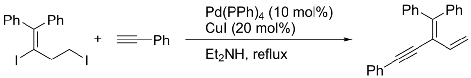 - The preparation of alk-2-ynylbuta-1,3-dienes from the cross-coupling of a diiodide and phenylacetylene, as shown below.[53]