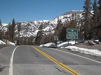 Sonora Pass (el. 9,624 ft. / 2,933 m.) is a mountain pass in the Sierra Nevada in California. It is the second-highest pass with a road in California and in the Sierra Nevada.[2] It is 321 feet (98 m) lower than Tioga Pass to the south.[3] State Route 108 traverses the pass, as does the Pacific Crest Trail.