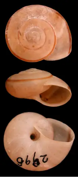 Like other species of the genus, the shell of S. neglecta is a little flatter than spherical, pale brown in colour with a chestnut peripheral band. Distinctive features of the shell are its relatively small size (15–17 mm diameter, c. 9 mm high), an umbilicus about a seventh of the diameter, and the surface sculpture of the protoconch.[1][8] The type specimen is now in the Natural History Museum of Los Angeles County (LACM 1451).[9]