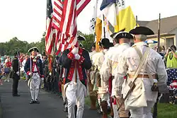 The society is involved in historical research, raising funds for local scholarships and educational awards, and preservation of sites and documents related to the American Revolution. The Sons of the American Revolution petitioned Congress to store Revolutionary era documents in a fire-proof area and make them available to the public, leading to the creation of the National Archives.[12] It is also active in cataloging and marking Revolutionary War patriot graves and conducts an annual Eagle Scout scholarship program. The society is active in promoting "patriotism", and was instrumental in the establishment of Constitution Day.[13] Numerous Sons of the American Revolution societies and chapters have active color guard groups that appear in various public and private venues as a means of community outreach.