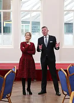 After her husband was created Duke of Edinburgh on his 59th birthday, Sophie and Edward visited Edinburgh to meet with members of the Ukrainian and Eastern European communities in the city, some of whom were displaced following the Russian invasion of Ukraine.[67] In May 2023, Sophie visited Iraq at the request of the Foreign Office to promote the Women, Peace and Security agenda and raise awareness about conflict-related sexual violence.[68] She became the first member of the royal family to visit Baghdad.[69]