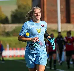 In July 2022 she moved in a free transfer[7] to Lewes FC[5] in the same year that their American raised goalkeeper Tatiana Saunders moved on to play for Durham.[8] Lewes are an unusual team because they offer equal pay to their male and female teams. Their top paid player is a woman.[4] The team did well in the FA cup in the 2022–2023 season making the quarter-finals where they were knocked out, three goals to one, by Manchester United W.F.C.[9]