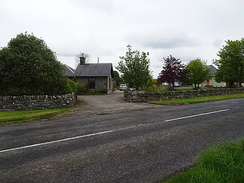 The nearby road was diverted via an overbridge and the single platformed station with signalbox, ticket office, etc. built on its old course. The single track line had a passing loop and a single siding beside a loading dock with a weighing machine present in 1895[2] and 1906.[3] The original station was rebuilt after a fire in 1880 by the Wigtownshire Railway.[4] The stationmaster's house and station building still survive as private dwellings (datum 2013).