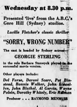 Sorry, Wrong Number is a 1958 Australian television play based on Lucille Fletcher's radio play Sorry, Wrong Number. It starred Georgie Sterling.[4]