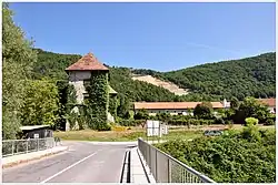 Soteska Mansion (German: Schloß Ainöd)[6] is now a ruin. It stood on the banks of the Krka River and was built by Count Georg Sigmund von Gallenberg in 1664 and 1689. It had a rectangular layout with an interior courtyard bordered by four two-story arcades, and four rectangular towers at the corners. The entry tower bore the crest of the Gallenberg and Schrottenbach families and the year 1675. The interior was richly painted, with some works attributed to the 17th-century Dutch painter Almanach.[7] Soteska Castle was characterized by Johann Weikhard von Valvasor as one of the most beautiful castles in Carniola.[6][7] The castle was sold to the Auerspergs in 1733, and then to the Counts of Lichtenberg in 1743. The Auerspergs reacquired the castle in 1793 and owned it until the Second World War. The Partisans looted and burned the castle on 23 October 1943,[4][6][8][9] and after the war many of the building stones were carried off.[7] The gardens in the castle grounds survive,[10] with a pavilion now referred to as the Devil's Tower (Slovene: Hudičev turn).[4][6] The tower contains paintings by the 17th-century Dutch painter Almanach.[4]