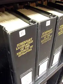 Subsidiary legislation currently in force in Singapore is published in looseleaf form in a series called the Subsidiary Legislation of the Republic of Singapore, which is gathered in black binders. New subsidiary legislation published in the Gazette may be viewed for free on-line for five days on the Electronic Gazette website.