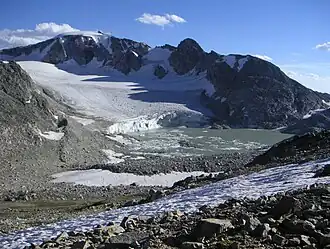 Sourdough Glacier is in the Wind River Range, Bridger-Teton National Forest in the U.S. state of Wyoming.[2] Sourdough Glacier is in the Bridger Wilderness, and is part of the largest grouping of glaciers in the American Rocky Mountains. The glacier extends from the north slope of Klondike Peak at an elevation range of 12,800 to 11,800 ft (3,900 to 3,600 m) and flows into a proglacial lake.
