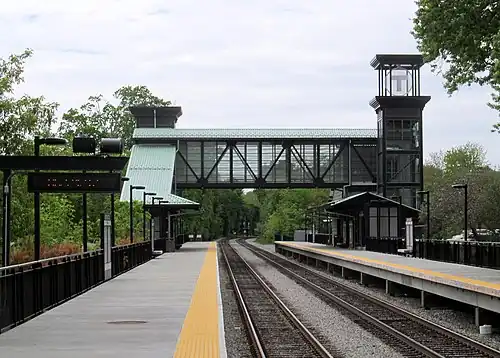 As part of a $277 million project upgrading the Fitchburg Line, South Acton station was completely rebuilt with two accessible high-level platforms connected with an overhead pedestrian bridge, as well as a drop-off lane off Maple Street.[3] The work began in 2012 and the new station opened on December 19, 2015.[4][1]
