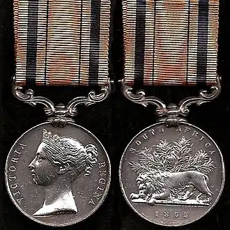 The South Africa Medal (1853) was awarded to surviving[2] participants in one or more of three campaigns in the eastern Cape of Good Hope and the Battle of Berea:[4]