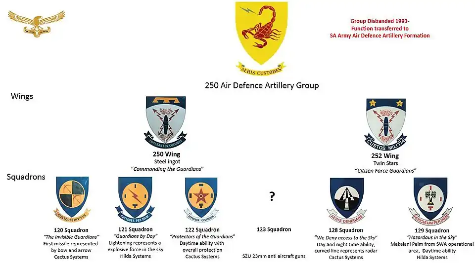 The 250 Air Defence Artillery Group, also known as the 250 Air Defence Unit (ADU), was a group of air defence squadrons that operated under the control of the South African Air Force tasked with airbase defence. The group consisted of 120, 121, 122, 123, 124, 125, 126, 127, 128, 129 and 130 Squadrons and had its own active Citizen Force component. These squadrons were equipped with the Tigercat mobile surface-to-air missile system, The Cactus surface-to-air missile system, the ZU-23-2 23mm Anti-Aircraft Gun and the Bofors 40 mm gun.