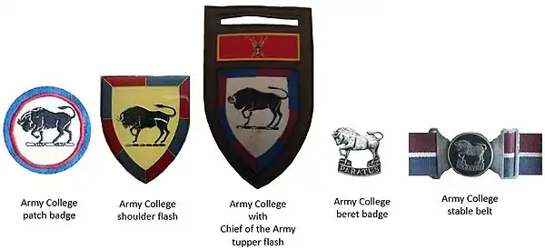 The wildebeest as the College’s symbol had been adopted around 1924. A shoulder flash was developed around 1963 displaying the wildebeest in a roundel of blue and maroon. The Wildebeest concept had originated from a trophy given to the Military School from the Mounted Rifles.