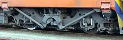 The Class 6E1 locomotives were built with an air brake system, consisting of various valves connected to each other with pipes, commonly referred to as a “bicycle frame” brake system. The compressed air pipe is run through bolster and other members and then in a zig-zag pattern under the locomotive's belly to extend its length, which allows the maximum amount of moisture to condense on the way to the reservoirs. As a result, it has multiple pipe connections. A weakness of the system was that, after an accident or even a hard coupling, these pipes tended to develop leaks at the joints which were extremely difficult to repair.[3]